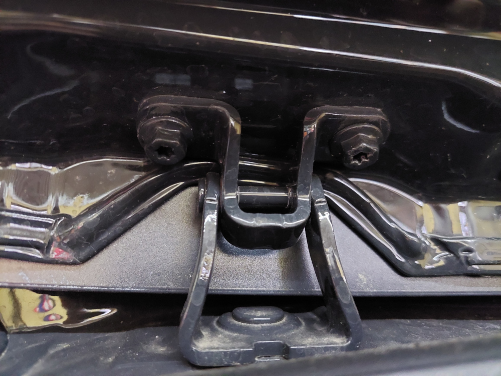 Setzen Sie mit Ihrem Helfer die neue Heckklappe an. Nun können Sie die Schrauben wieder ansetzen, sodass die Bolzen der Scharniere die Klappe wieder festhalten und sie nicht mehr herunterfÀllt. Ziehen Sie die Schrauben noch nicht komplett fest, da die Klappe noch eingestellt werden muss.